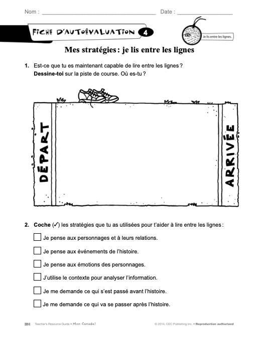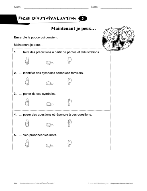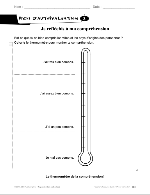 One of the strengths of these documents is their use of graphics to communicate progress and understanding. When students are learning a second language, it’s important to keep as much as possible in the target language, but the vocabulary for self-assessment or reflection is an add-on to a traditional language program. The use of graphics does a nice job of communicating that meaning, and is a great basis from which to work. In image 1, the student draws themselves on the mountainside to represent their progress towards their goal of reaching the top. In image 2, the student circles a thumbs up, thumb straight across or thumbs down icon that represents whether they can or can’t perform a given skill (the skills can be edited and changed) or whether their progress is somewhere in the middle. In image 3, the student colours the thermometer to indicate how far their understanding has progressed up the scale. In image 4, the student draws their progress on the race course and checks the applicable item on the list to show which skills or strategies they used to support their progress.