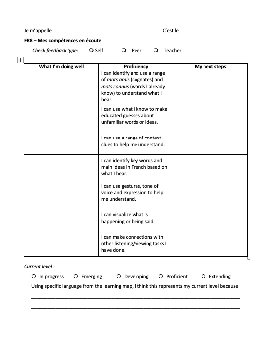 For the past two years, I have been working with a new program for Core French 8-10. As with most classroom-ready programs, it comes with pre-made assessment tools, which can be edited in Word to include the elements I’ve learned through my research, and to align more closely with the learning maps I’m using. This program was published in Québec, and although second language curricula across Canada are not wildly different from one another, differences do exist and the templates need to be adjusted to accommodate both that factor and the differences in how teachers use these documents in their classroom assessment. Here’s what I have as a basic starting point within the program: