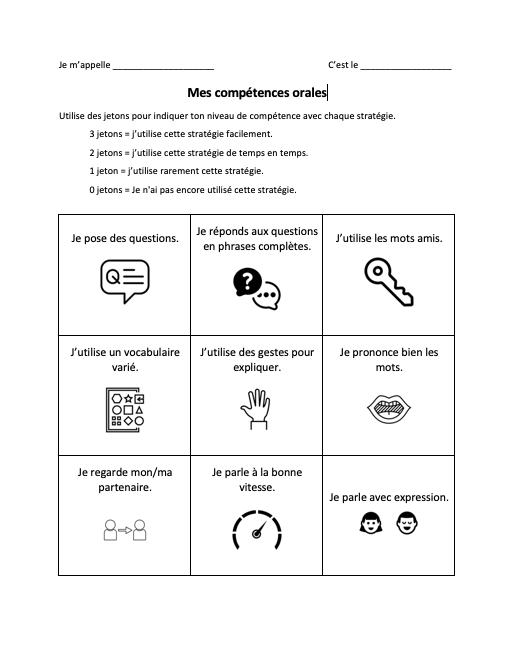 I typically ask students to create a video of their oral work, and upload it to FreshGrade (the digital portfolio platform I use in my classes). After completing the task, they will view the video and use the strategy sheet pictured above to self-assess and reflect on their strategy use. They will use plastic tokens (shown in the second image, above) to indicate their level of growth in a skill by placing 3 tokens on a square to show that they can use that skill easily, 2 tokens if they sometimes use it, 1 token if they rarely use it, and no tokens if they are not using it yet. They will take a photo of the sheet with the tokens placed on it, and upload that photo to FreshGrade as part of their reflection on the assignment. The photo can then be used as part of a post-assignment conference either with a partner or with me, or can be elaborated on using a written response question in English, also posted on FreshGrade. Over time, students should see an increasing number of tokens appearing on their pages, and develop their skills in a range of contexts. The skills shown can be edited and changed as needed, or a blank version can be handed out for students to fill in with other skills that are being targeted in a given task.