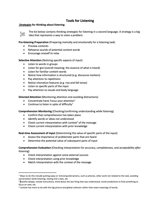 I’ve created a Google Docs version of this list that can be viewed here for more detail. I’m still working on how to introduce this to students. The idea is not that they use all of the strategies and/or all of the tactics on a given assignment, but that they start with 2 or 3 that they practice and get comfortable with. There are four goals here: (1) widen the range of strategies and tactics, (2) learn to choose strategies and tactics that work best with a given type of listening, (3) get better at using them, and (4) engage in dialogue with peers about the process of listening, not just the product.