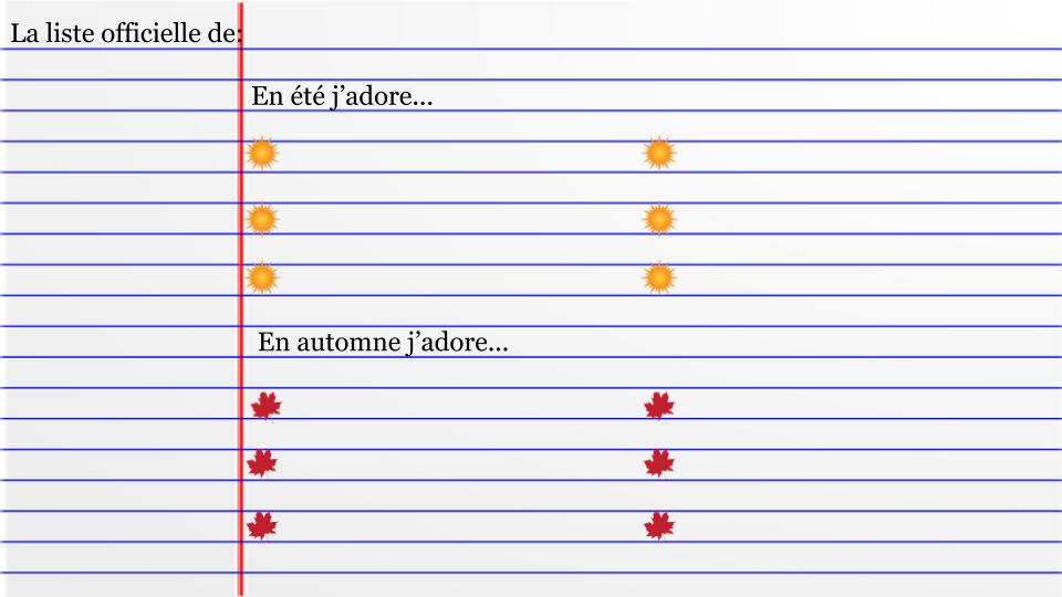 Each year when I start with a new class of French 8 (the youngest group I teach), I get a selection of kids from all different levels and backgrounds. It’s not unusual to have some students who’ve never studied French at all, some who have a pretty solid foundation, and everything in between. This is an activity I do pretty near the beginning of the course, as a way to see how much vocabulary kids know, what they know about basic structures like nouns and determiners, and so on. This is a list poem about summer and fall, and I also use it as an early introduction to the skill of expressing preferences.