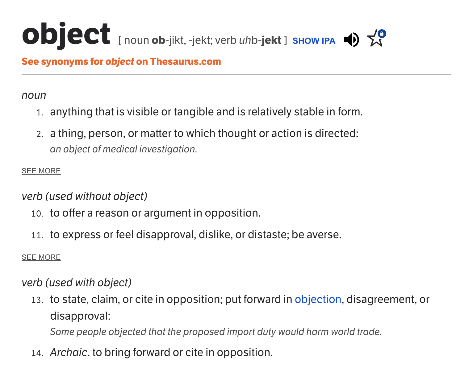 For example, in a unit I’m currently working on, students encounter the word “objet” (equivalent to our English word “object”). The Larousse online dictionary definition of this word gives 15 different possible meanings for this word. Knowing that my students will be working from English to French (at least in their minds), I also consulted an English source to see if there were any connections I might have overlooked. Dictionary.com lists 14 possible meanings. We’re one word in, and we already have a lot of complexity and possible mismatches between English and French. Digging a little deeper, we see that all 15 of the Larousse definitions of this word in French relate to its use as a noun. The Dictionary.com definitions relate to its use as a noun, as a verb used with an object, and as a verb used without an object. The OED brings even more complexity to the table by also listing ways in which “object” can be used as an adjective.